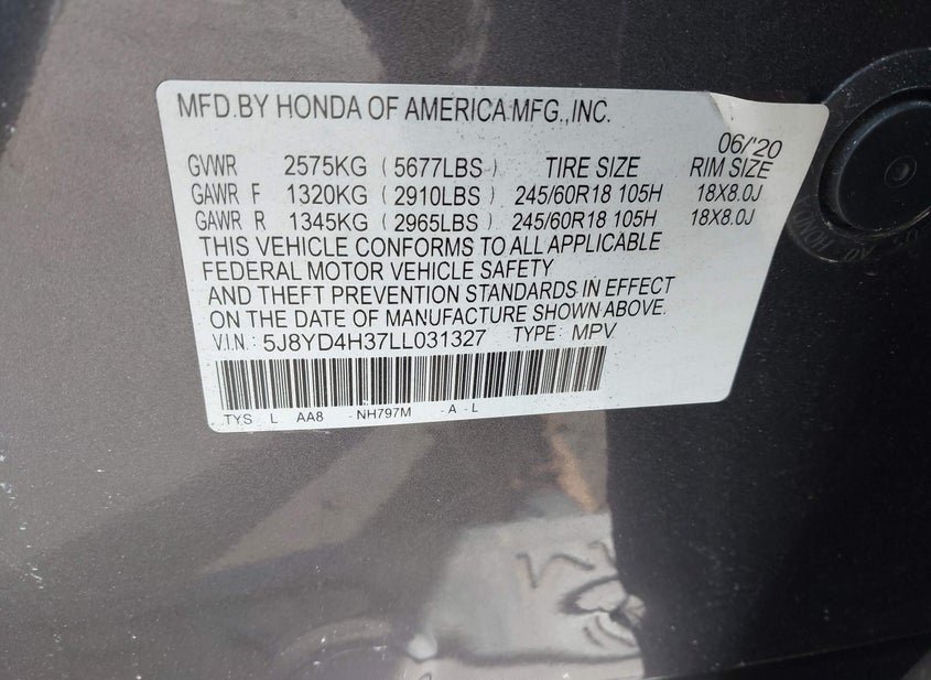 - VIN: 5J8YD4H37LL031327