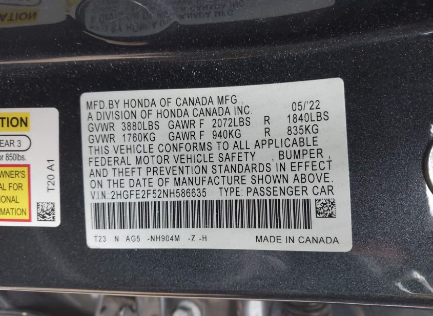 - VIN: 2HGFE2F52NH586635