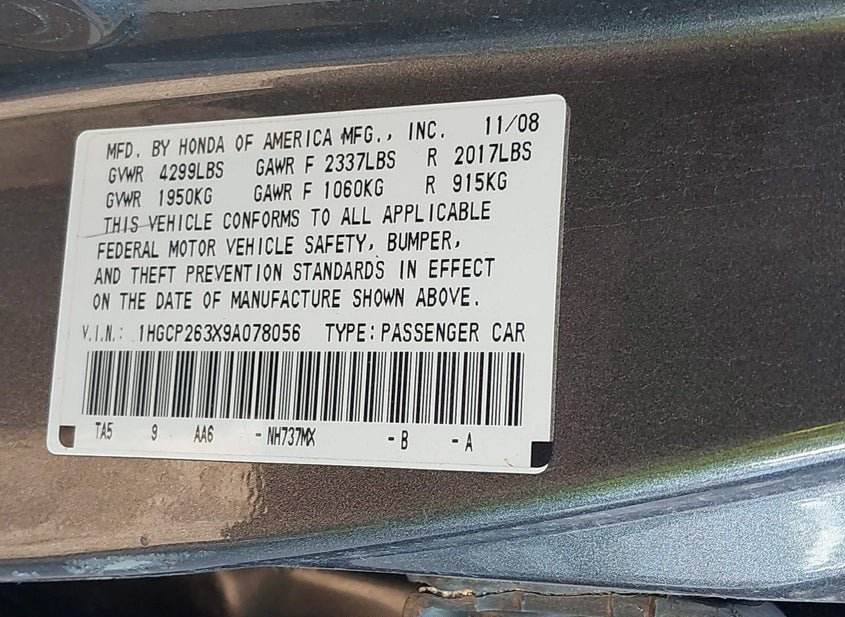 - VIN: 1HGCP263X9A078056