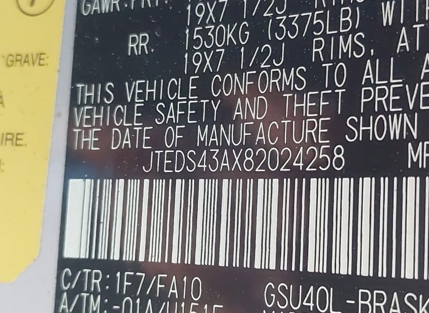 - VIN: JTEDS43AX82024258