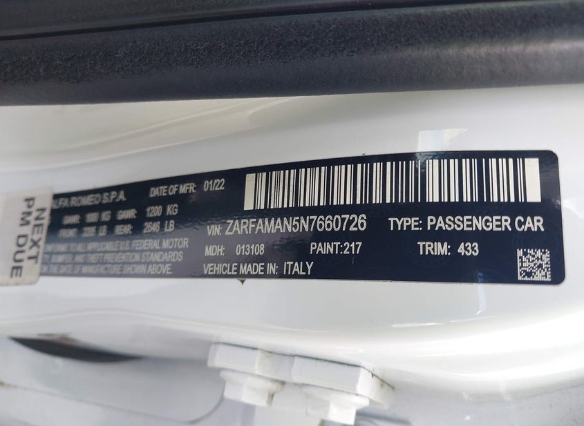- VIN: ZARFAMAN5N7660726