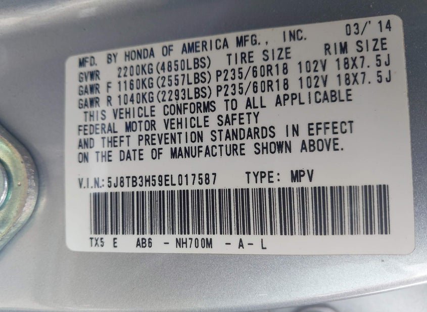 - VIN: 5J8TB3H59EL017587
