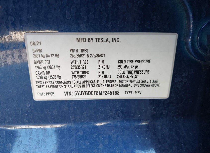 - VIN: 5YJYGDEF8MF245168