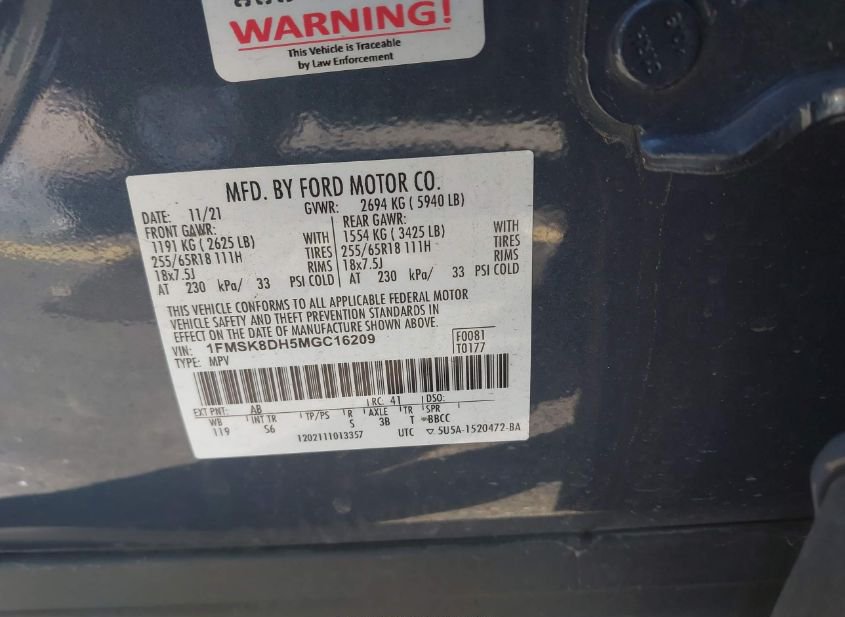 - VIN: 1FMSK8DH5MGC16209