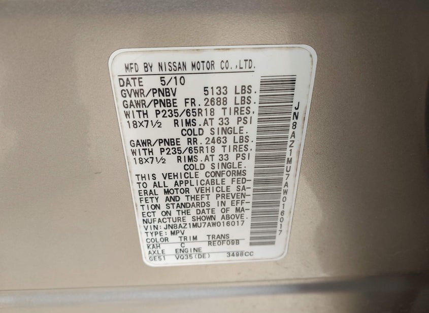 - VIN: JN8AZ1MU7AW016017
