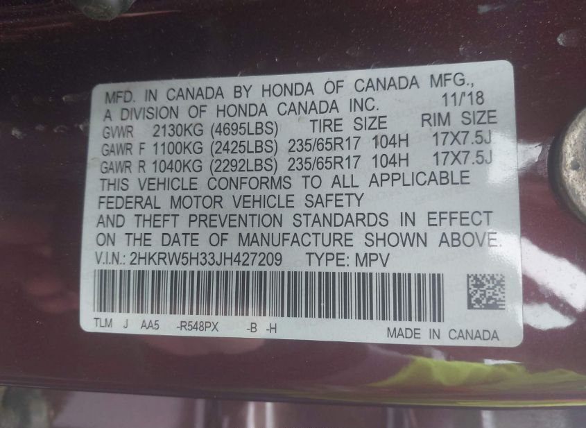 - VIN: 2HKRW5H33JH427209