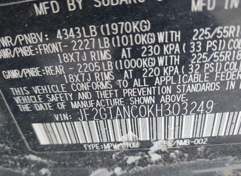 - VIN: JF2GTANC0KH303249