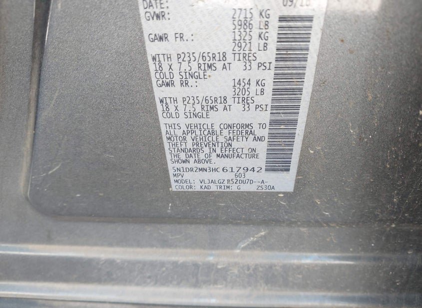 - VIN: 5N1DR2MN3HC617942