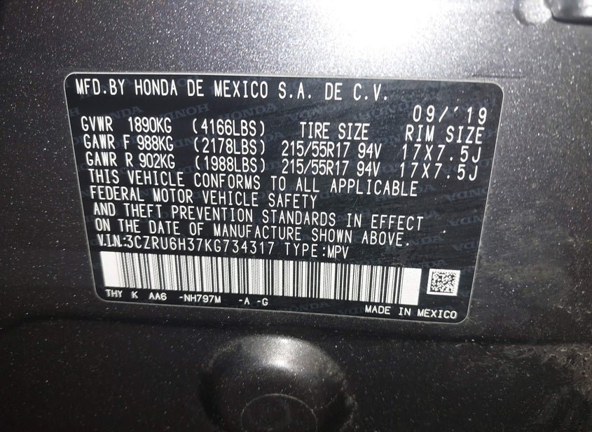 - VIN: 3CZRU6H37KG734317