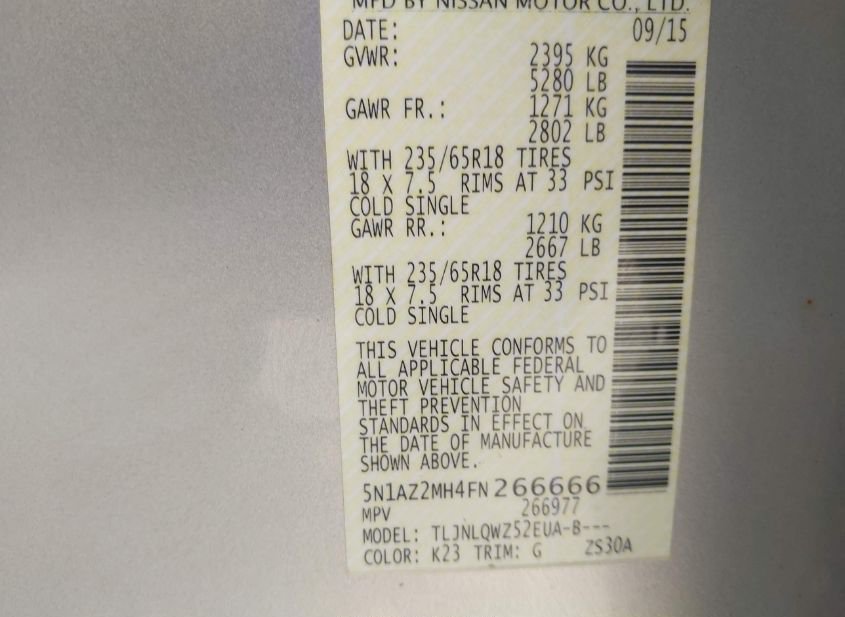 - VIN: 5N1AZ2MH4FN266666