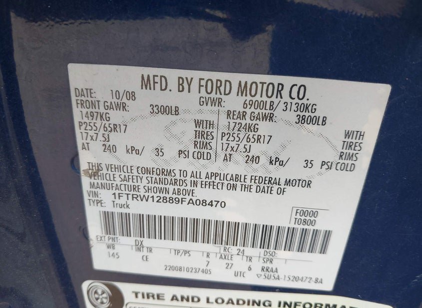 - VIN: 1FTRW12889FA08470