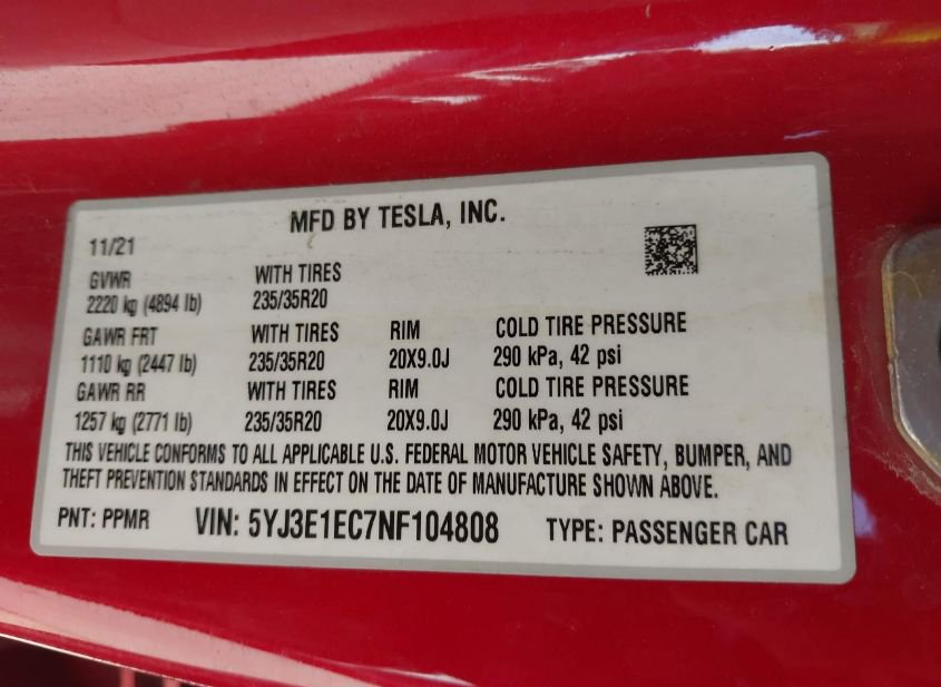 - VIN: 5YJ3E1EC7NF104808