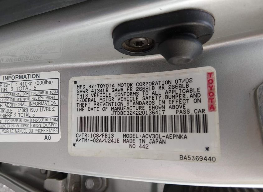 - Название лота: 2002 TOYOTA CAMRY LE