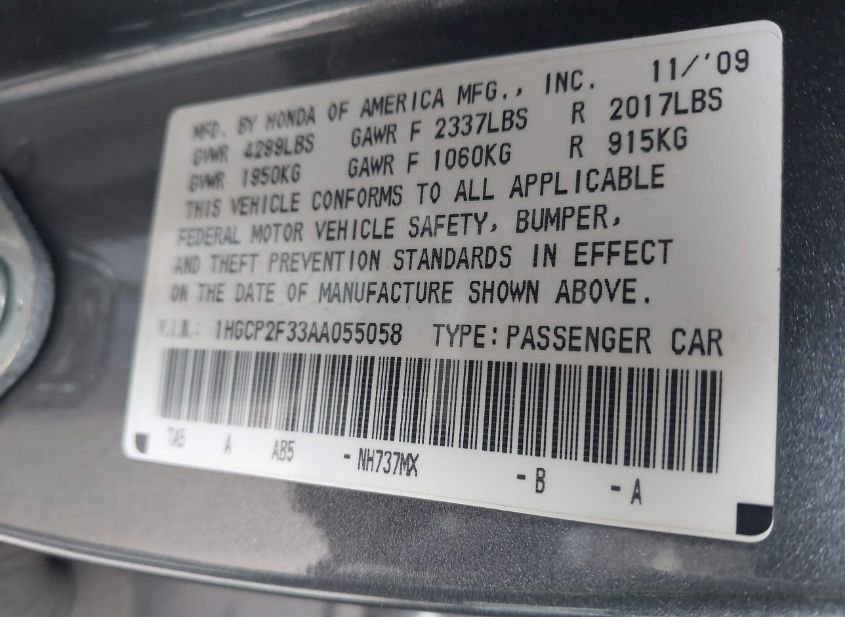- VIN: 1HGCP2F33AA055058