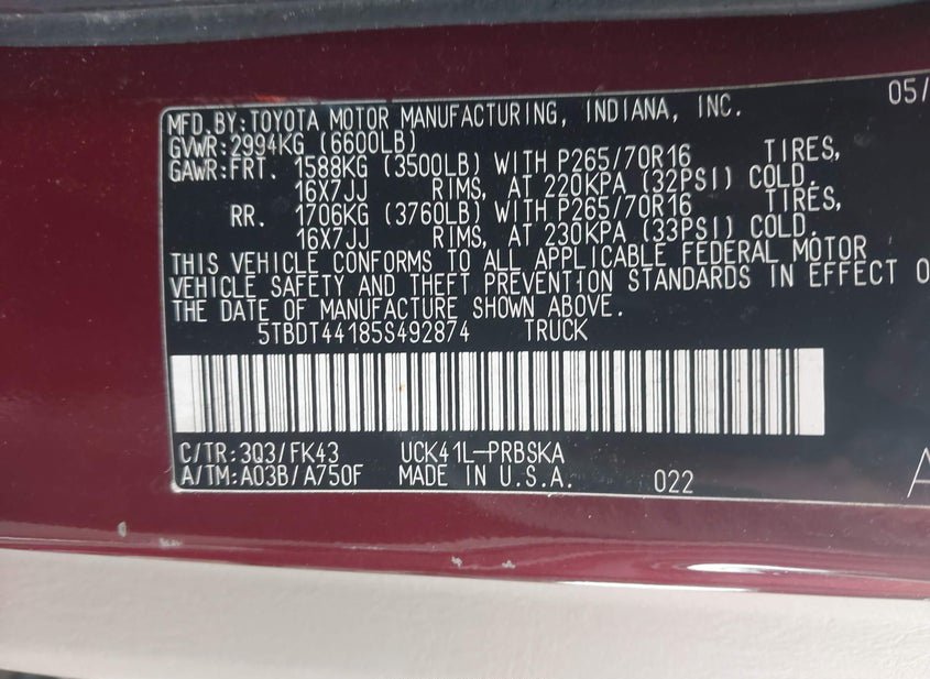 - VIN: 5TBDT44185S492874