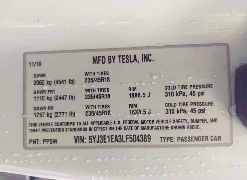 - VIN: 5YJ3E1EA3LF504389