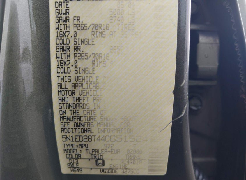 - VIN: 5N1ED28T44C651524