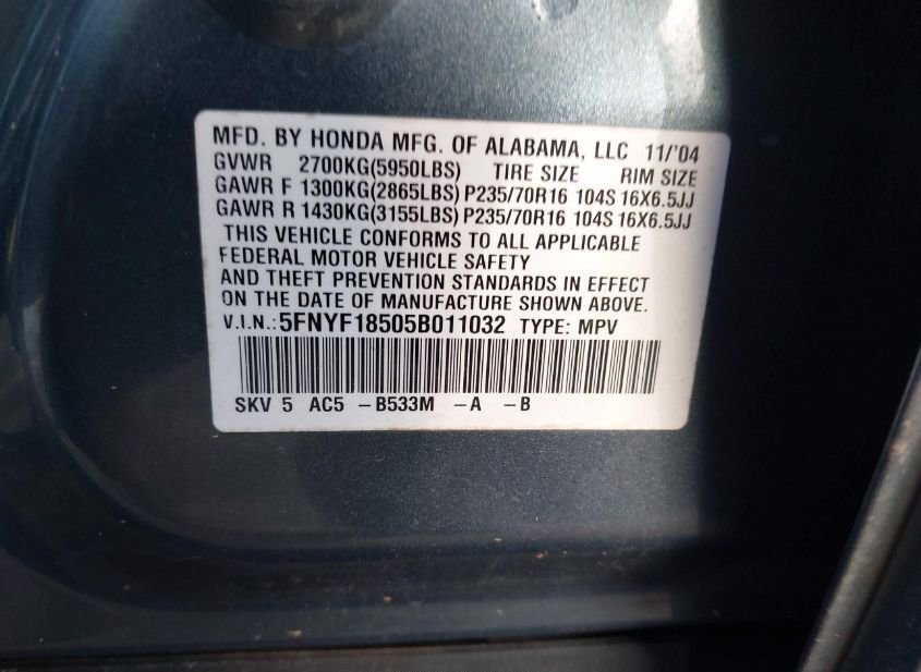 - VIN: 5FNYF18505B011032