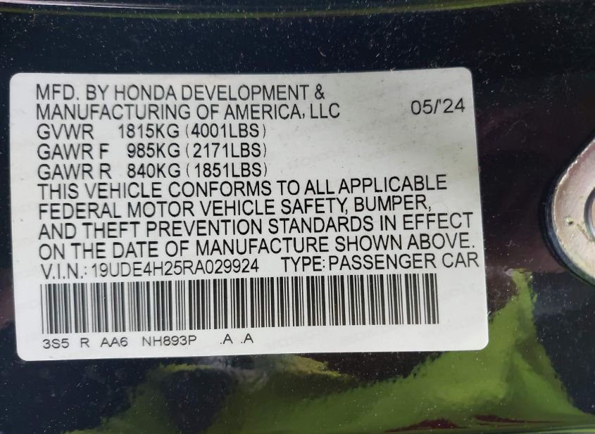 - VIN: 19UDE4H25RA029924