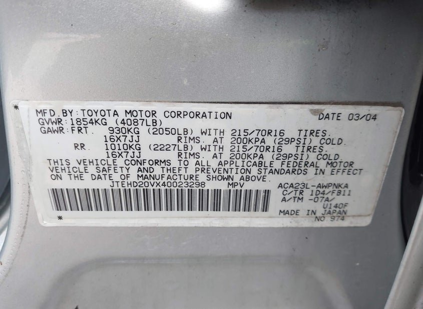 - VIN: JTEHD20VX40023298