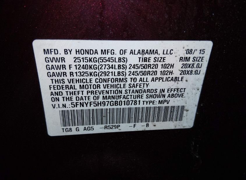 - VIN: 5FNYF5H97GB010781