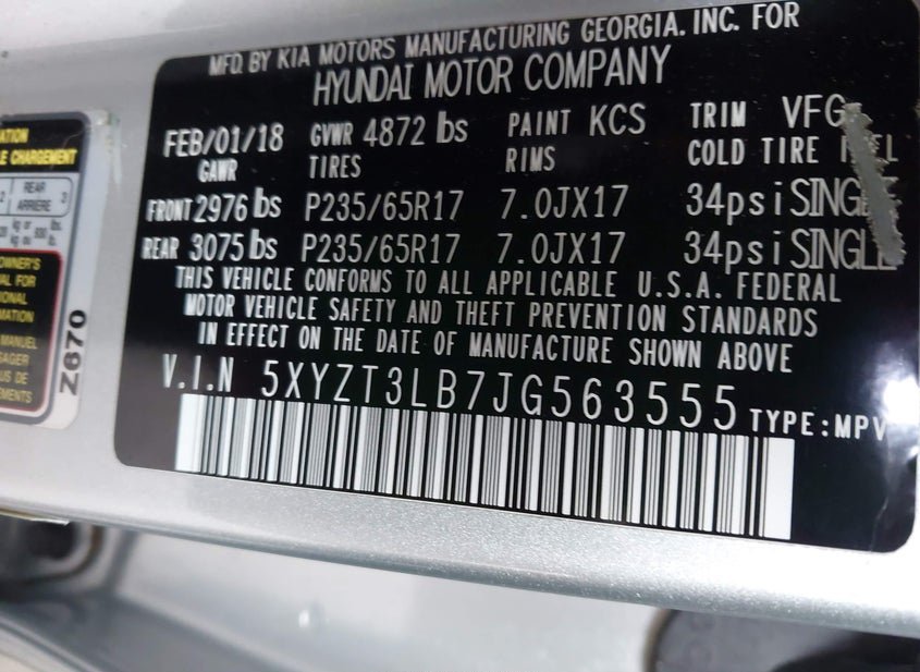 - VIN: 5XYZT3LB7JG563555