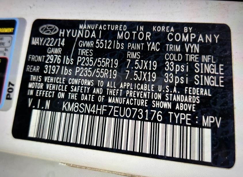 - VIN: KM8SN4HF7EU073176