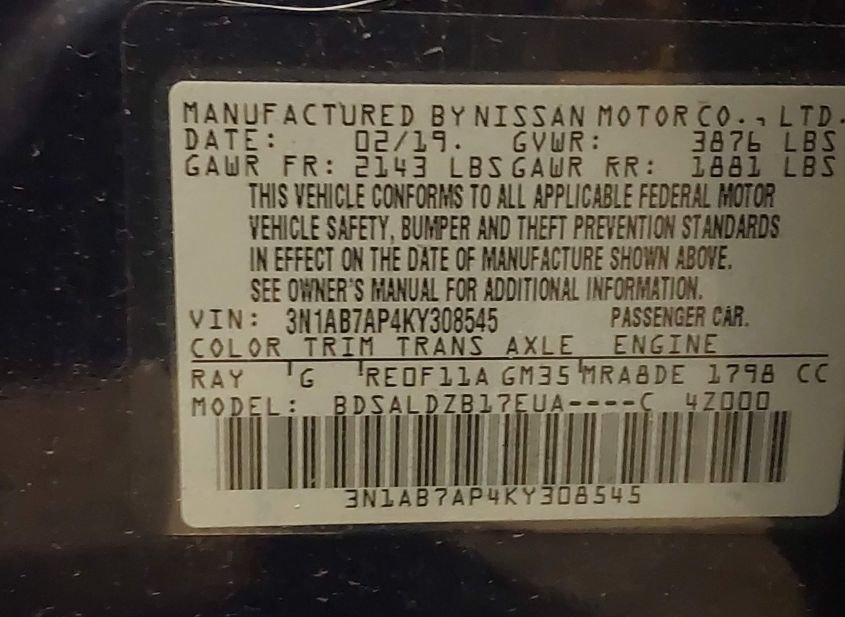 - VIN: 3N1AB7AP4KY308545
