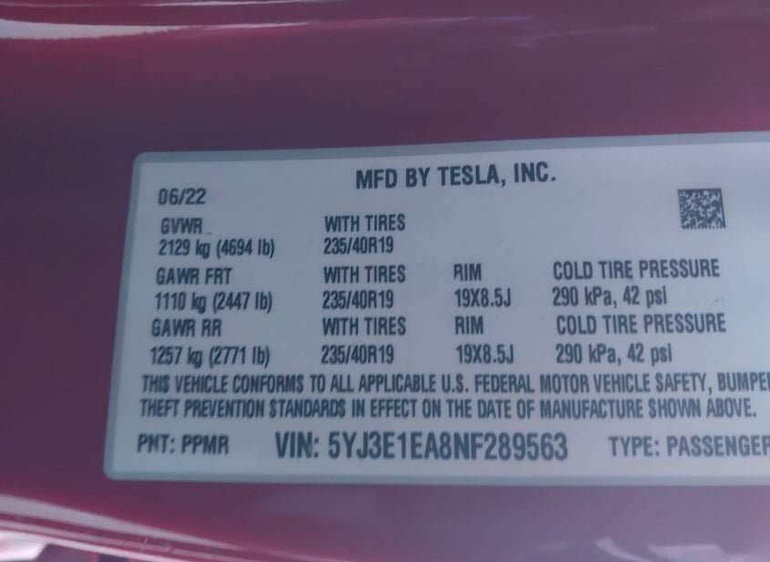 - VIN: 5YJ3E1EA8NF289563