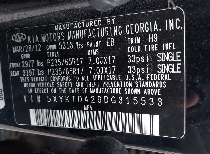- VIN: 5XYKTDA29DG315533