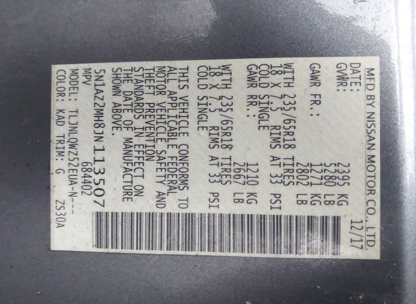 - VIN: 5N1AZ2MH8JN113507