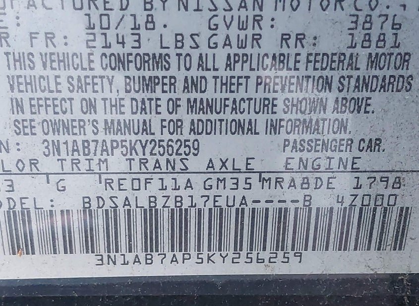 - VIN: 3N1AB7AP5KY256259