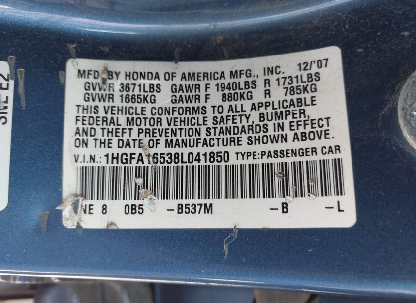 - VIN: 1HGFA16538L041850