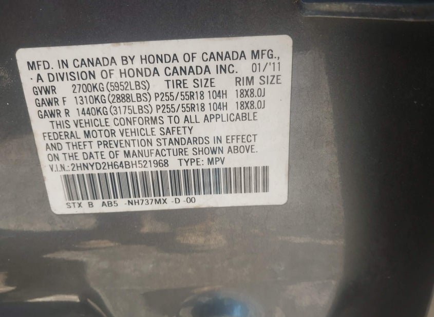 - VIN: 2HNYD2H64BH521968