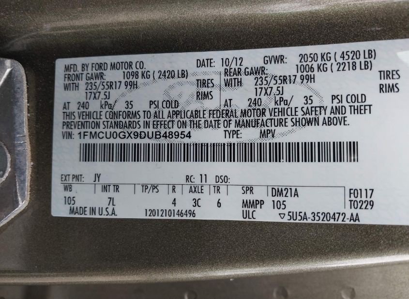- VIN: 1FMCU0GX9DUB48954