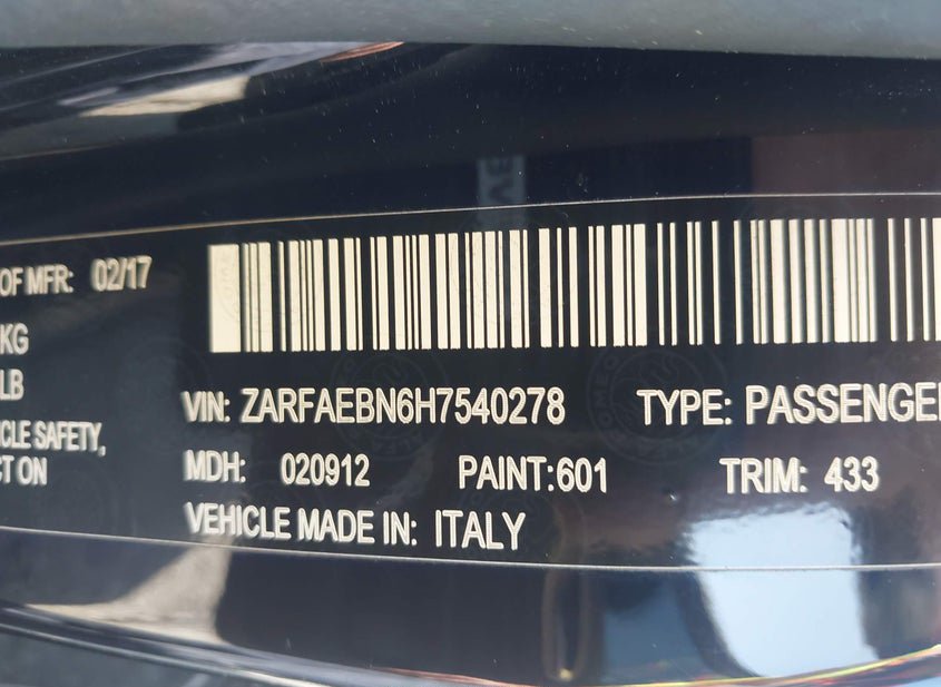 - VIN: ZARFAEBN6H7540278