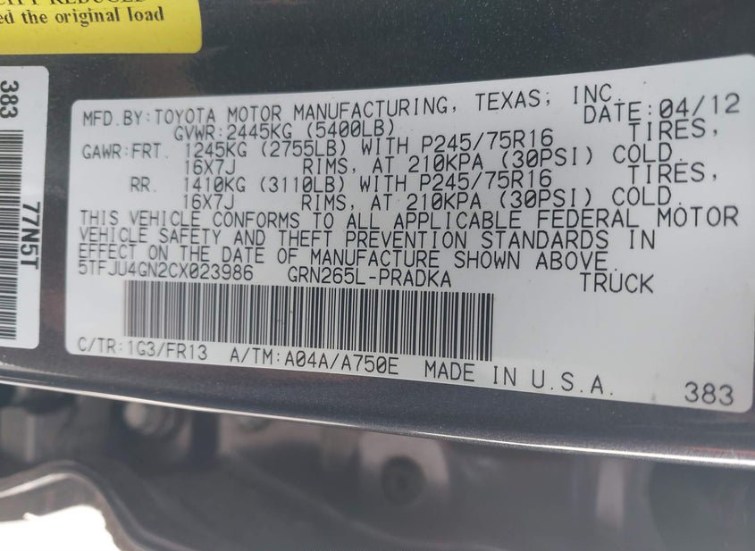 - VIN: 5TFJU4GN2CX023986