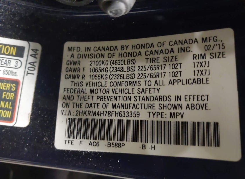 - VIN: 2HKRM4H78FH633359