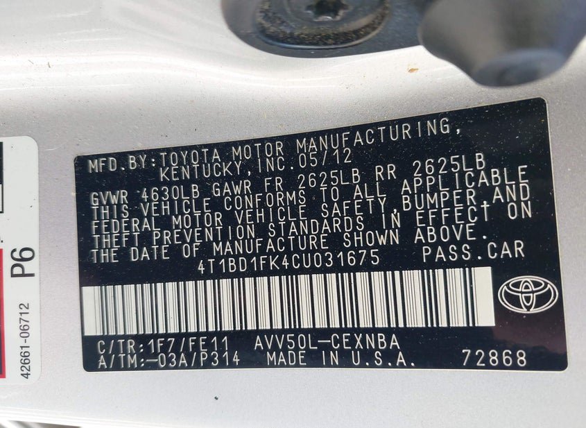 - VIN: 4T1BD1FK4CU031675