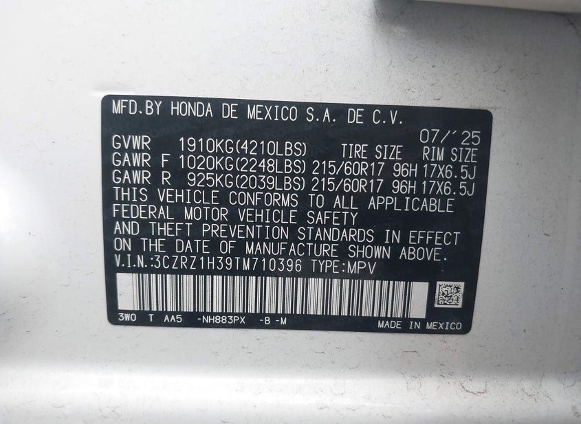 - VIN: 3CZRZ1H39TM710396