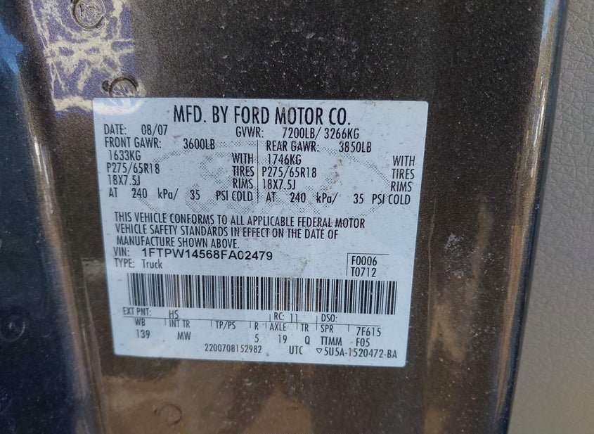 - VIN: 1FTPW14568FA02479