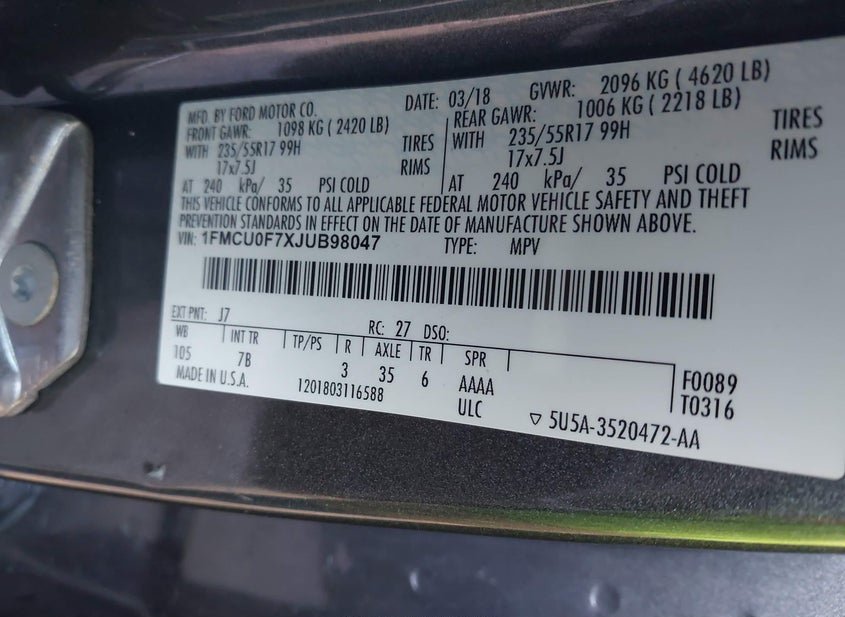 - VIN: 1FMCU0F7XJUB98047