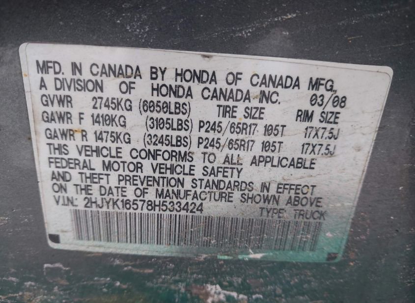 - Название лота: 2008 HONDA RIDGELINE RTL