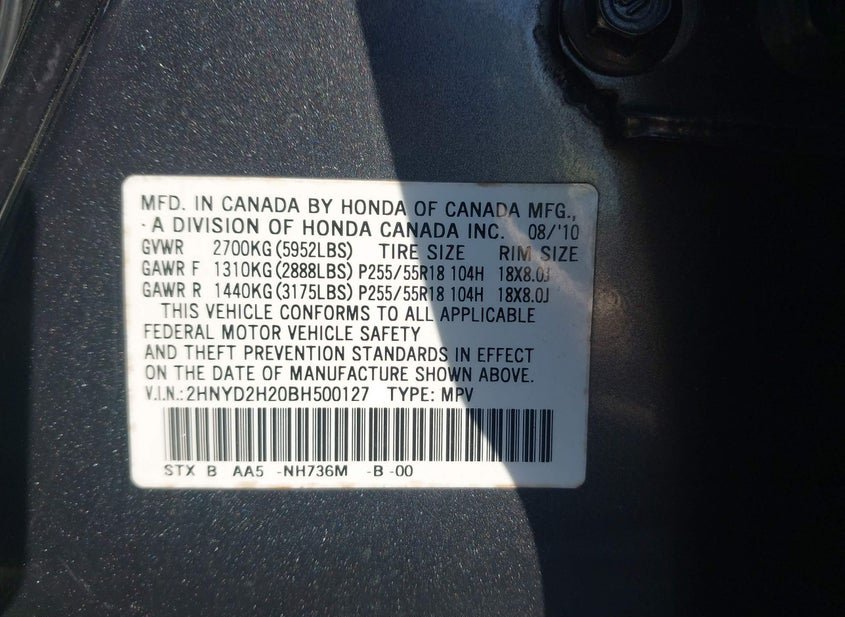 - VIN: 2HNYD2H20BH500127