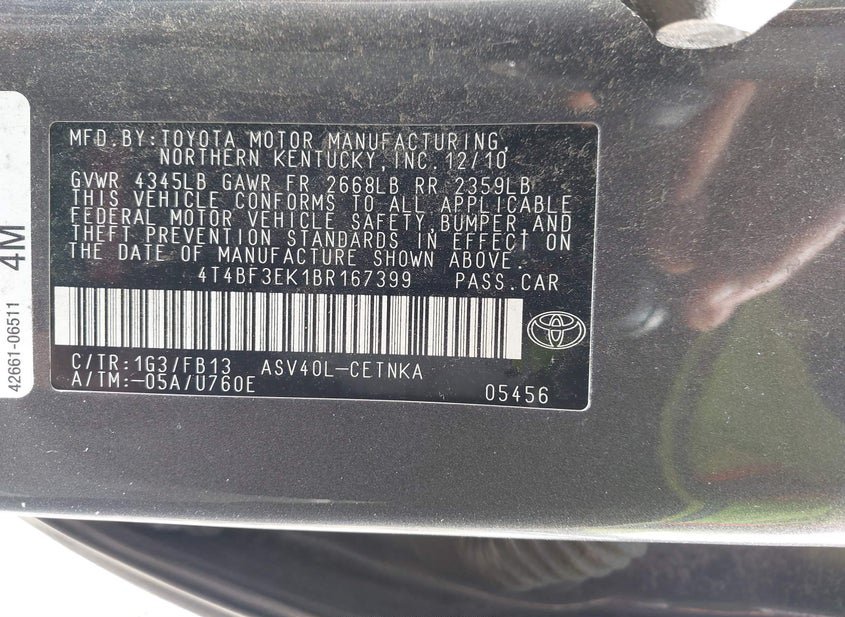 - VIN: 4T4BF3EK1BR167399