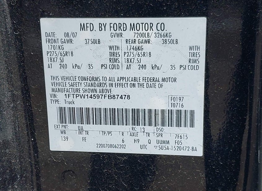 - VIN: 1FTPW14597FB87478