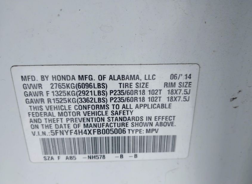 - VIN: 5FNYF4H4XFB005006
