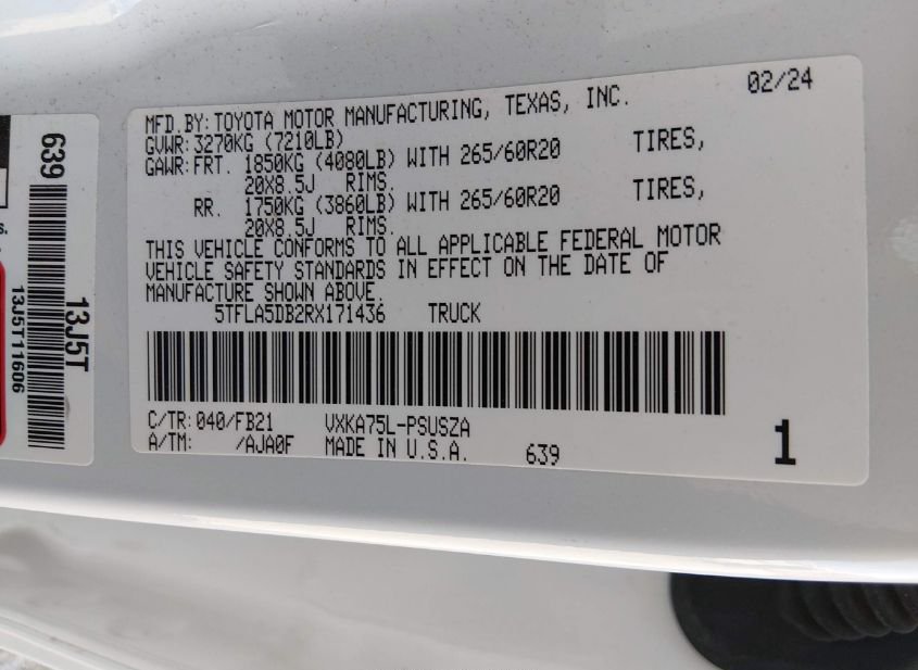- VIN: 5TFLA5DB2RX171436