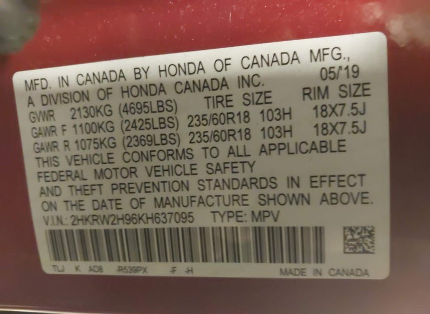 - VIN: 2HKRW2H96KH637095