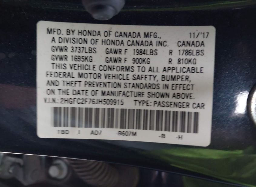 - VIN: 2HGFC2F76JH509915
